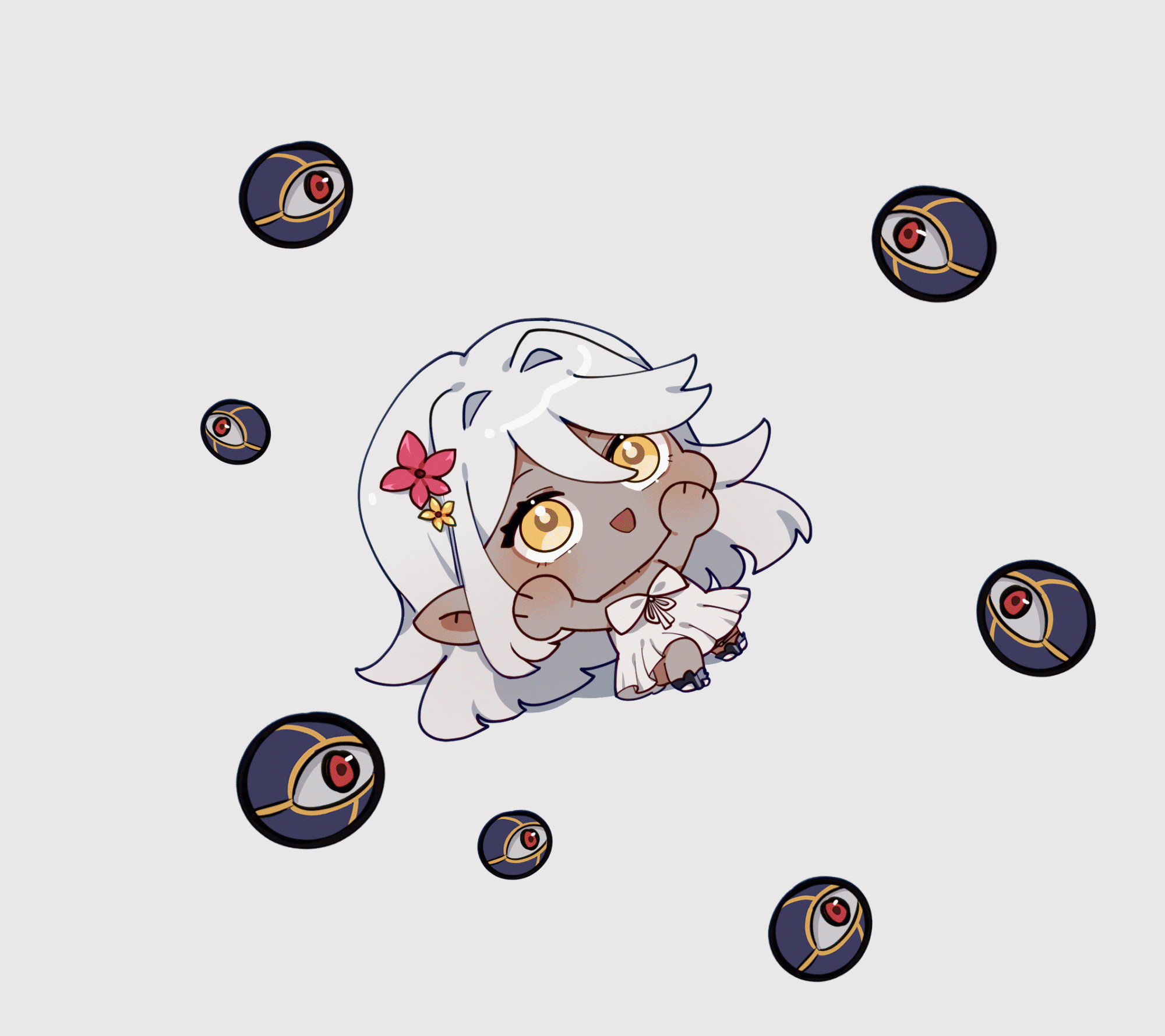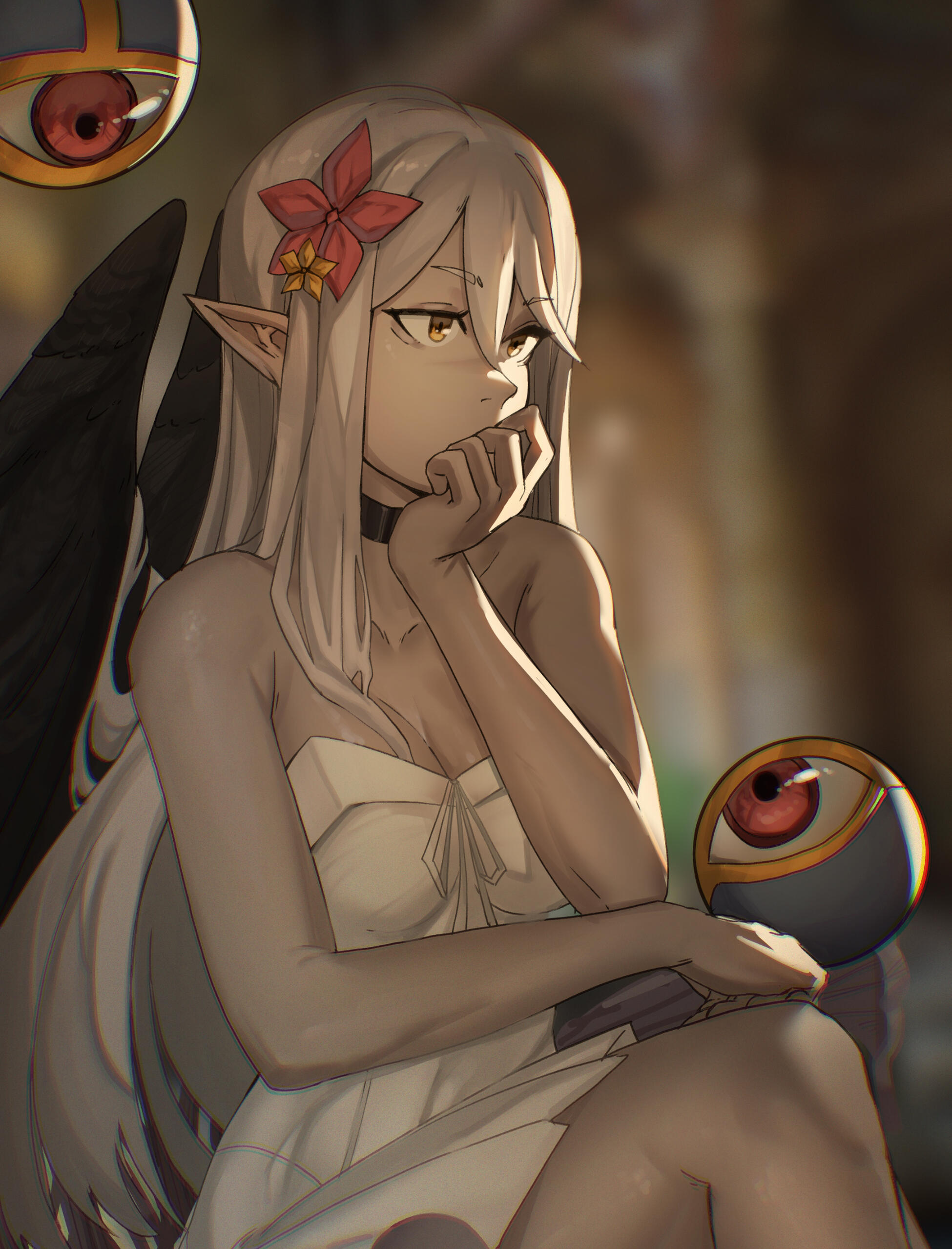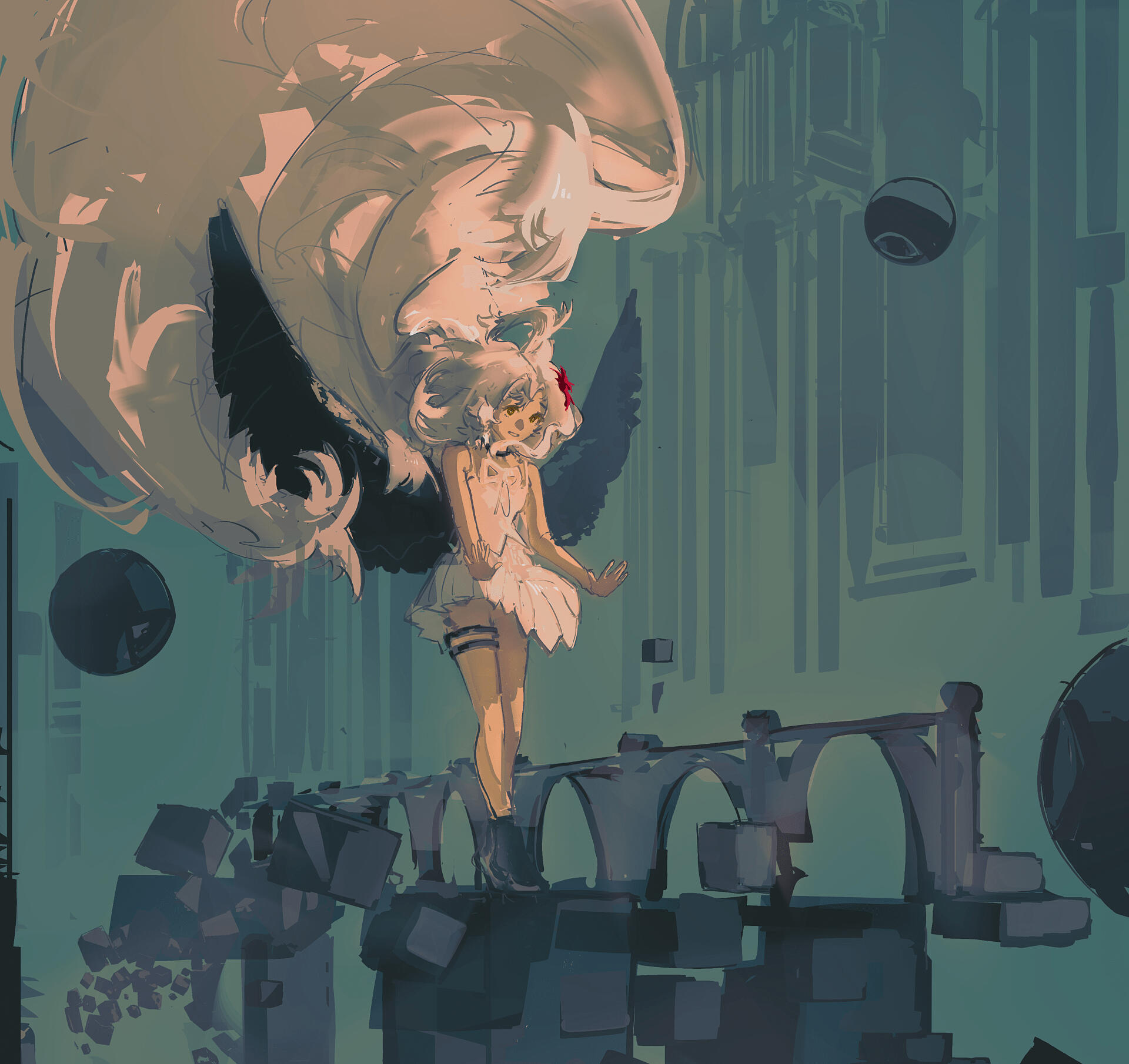 A pale young woman with soft features who sticks out due to her peculiar choice of attire, a short white dress that just barely covers her thighs. Some beloved hairpiece can be found nestled at the top of her long ivory locks, a droplet of color across a monotone sea. Bright yellow eyes finish off the look, ever drifting from one curious thing to the next- even to things oft left unseen.Lately, two lofty wings adorn the girl's back, sometimes moving and shifting as if a pair of shadows when the observant watches for too long.